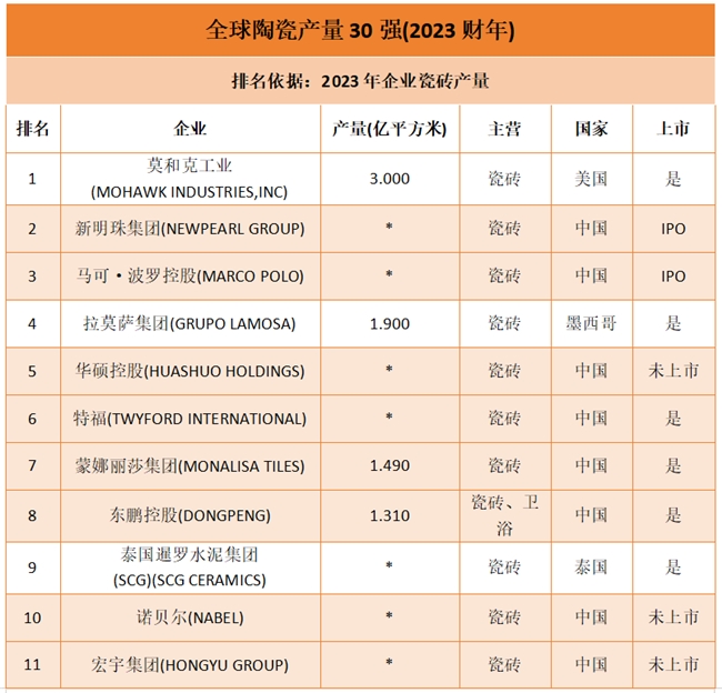 《陶城报》社主办的“世界陶瓷卫浴100强(2023财年)发布会”上,重磅揭晓了多项重磅榜单,包括“全球瓷砖产量30强”,该榜单以2023年度企业瓷砖“产量”为唯一评选依据,涵盖了全球主要产瓷国家的代表性品牌,是行业观察、资本分析和市场战略的重要风向标。其中,大角鹿瓷砖在“全球瓷砖产量30强”榜单上位列第21名。